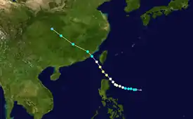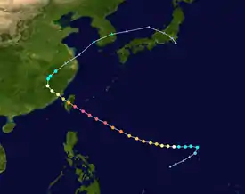 Typhoon Iris, which formed on August 19 to the east of Luzon, passed near the northeastern portion of the island on the 21st as a minimal typhoon. It turned to the northwest, peaking at 105 mph (169 km/h) before weakening to a tropical storm. Iris made landfall on southeastern China on the 22nd, and quickly dissipated.[4] Typhoon Iris caused rough seas off the coast of Luzon, sinking at least two ships and killing 89 people.[4] In China, the storm brought torrential rains, killing 720 people with 996 missing in the Fujian province in southeast China;[4] however, according to the National Oceanic and Atmospheric Administration, the death toll may be as high as 2,334.[5]