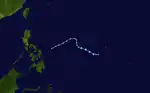 On September 6, reports from aircraft indicated the existence of a tropical storm near the International Date Line. Earlier stages were missed because of a lack of data in the isolated area. A trough moved Patsy northeast. A second trough then developed, dominated over the first, and recurved Patsy northeast. It then slowly headed northwards and gradually weakened. It dissipated on September 10. Patsy's erratic path near the dateline was unusual and no known tropical cyclone had taken such a path over the previous ten years,[7] although that of Typhoon June 1958 was somewhat similar.[8]