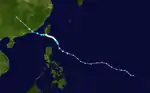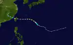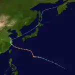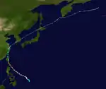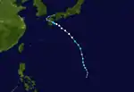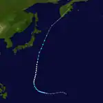 A circulation was first reported from a ship 300 miles west of Guam on September 26. The system then quickly intensified into a typhoon and made a northward turn directly towards Japan. During this period, a favorable environment allowed the typhoon to intensify to peak winds of 160 mph. The storm then turned westwards, passing 15 miles under Okinawa. The town of Naha, Okinawa received sustained winds of 85 mph with gusts of 120 mph. The much-weakened typhoon made landfall on the Chinese mainland 100 miles south of Shanghai on October 4. It caused 11 deaths, over $6 million in crop damage, and the Lebanese merchant ship Sheik ran aground off of Kitadaitōjima, killing 2. The Taiwanese military exercise Sky Soldier was canceled due to the typhoon. The system then recurved outwards due to westerly winds into the Sea of Japan with sustained winds of 30 mph. The remnants began an extratropical transition and dissipated in the Sea of Okhotsk.[9]
