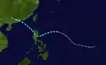 Ellen was the most destructive typhoon of 1961 for the Philippines. Impacts from Ellen were most severe on Catanduanes island when the center passed within ten miles from the northern point of the island. The eye during this time was about thirty-six miles across and had winds of 150 mph within the eyewall. Damages were placed at about $500,000 at the Coast Guard Loran Station[22] while damage elsewhere is estimated at about ₱2 million. Several people were reported either missing or dead.[23] A Panamanian freighter carrying logs to Hong Kong sank in the South China Sea, near the Spratly Islands, due to squally weather on December 9. Thirty-three of the crew members were lost to the turbulent sea.[14]