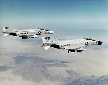 The Tri-Service system was first enacted on 6 July 1962 by the DoD Directive 4505.6 "Designating, Redesignating, and Naming Military Aircraft" and was implemented via Air Force Regulation (AFR) 66-11, Army Regulation (AR) 700-26, Bureuea of Weapons Instruction (BUWEPSINST) 13100.7 on 18 September 1962.[2] Anecdotally, the Tri-Service system was partly brought about due to Secretary of Defense Robert McNamara's confusion and frustration with the different designation systems the Navy and Air Force used at the time which resulted in the F-4H and F-110 both being used to refer to, essentially, the same aircraft.[3][4] The Tri-Service aircraft designation system was presented alongside the 1963 rocket and guided missile designation system in Air Force Regulation (AFR) 82-1/Army Regulation (AR) 70-50/Naval Material Command Instruction (NAVMATINST) 8800.4A (published 27 March 1974)[Note 1] and the two systems have been concurrently presented and maintained in joint publications since.[5][6][7]