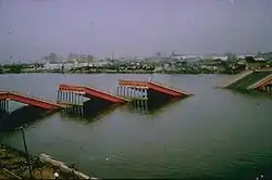 There were 3,534 houses destroyed and a further 11,000 were damaged.[2] This level of damage is explained by the influence of poor sub-soil conditions. Most of the lower part of the city of Niigata is built on recent deltaic deposits from the Shinano and Agano rivers, mainly consisting of unconsolidated sand. Shaking during the earthquake caused liquefaction with instantaneous compaction and formation of many sand volcanoes.[2][4] Maps of areas of subsidence and sand volcanoes were found to match closely with old maps of the position of former river channels. Subsidence of up to 140 cm was measured over wide areas associated with the liquefaction. In one area of apartment buildings built on reclaimed land by the Shinano River, most of the apartment blocks became inclined and one of them was completely overturned. This was despite relatively low levels of ground acceleration recorded by strong motion accelerographs placed in one of these buildings.[4]