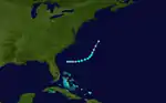 Satellite imagery and ship data indicated that Subtropical Depression Three formed at 18:00 UTC on June 14 to the northeast of the northeastern Bahamas,[5][7] associated with an upper-level low. With a ridge to the northeast, the depression moved northwestward toward the Southeastern United States.[8] Conditions were not favorable for strengthening, with cool air and minimal outflow, although the cyclone acquired gale-force winds by 12:00 UTC on August 16, becoming a subtropical storm.[5][7] Shortly thereafter the system's circulation contracted, indicative of a transition to tropical status 12 hours later. An approaching cold front turned the system northeastward on June 18.[8] At 02:00 UTC, the minimal tropical storm moved ashore near Little River Inlet, South Carolina, with winds of 40 mph (65 km/h). Weakening to a depression as it headed inland, the cyclone lost tropical characteristics by 12:00 UTC on June 19.[5][7] Having transitioned into an extratropical storm, its remnants continued to the northeast, restrengthening slightly to 50 mph (85 km/h) a day later. Early on June 22, the system was absorbed by the front, and continued to the northeast into Nova Scotia. The system dropped locally heavy rainfall, peaking at 8.86 in (225 mm) in North Wilkesboro, North Carolina.[8] In South Carolina, the rains caused flooding near Myrtle Beach, concurrent with 2.5 ft (0.76 m) above-normal tides, which caused $15,000 in damage, mostly to crops. Farther north, the rains were beneficial,[5] with totals as high as 6.71 in (170 mm) in Saco, Maine.[8]