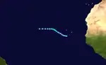 An area of convection developed off the west coast of Africa following the westward passage of Tropical Depression Sixteen. On October 5, it is estimated that Tropical Depression Seventeen developed from this system,[4] based on the convective appearance on satellite imagery. Three ships reported 40 to 45 mph (64 to 72 km/h) winds on October 6,[5] which was the basis for the NHC upgrading it to Tropical Storm Ginger, in conjunction with data from Cabo Verde.[19] At the time, the storm was located about 400 mi (645 km) north-northwest of Dakar, Senegal, well east of 35° W where the NHC began issuing formal tropical cyclone advisories. Instead, the Rota, Spain Naval Fleet Station issued gale warnings in relation to the storm.[19][20] Later on October 6, it was estimated that Ginger reached peak winds of 50 mph (85 km/h) and a minimum barometric pressure of 1,007 mbar (29.7 inHg). On October 7, the storm curved west-southwestward and quickly weakened into a tropical depression. Ginger dissipated on October 8 to the north of Cabo Verde.[6]