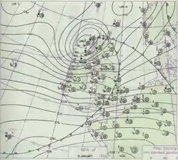 The origins of this violent storm appear to be from a cold front near Bermuda on 13 January 1968.[2] The system moved north of the Azores the next day and still appeared as a shallow low pressure area. In the next 24 hours, this low explosively deepened 50 millibars to 956 mb (28.2 inHg) and passed over Central Scotland.[2][12] The storm continued to move over Northern Europe before dissipating on 18 January 1968.