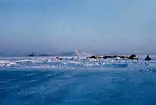 A base camp (named "Camp Hunziker"[40] after Richard Overton Hunziker, the USAF general in charge of the operation), was created at the crash site; it included a heliport, igloos, generators and communications facilities. A "zero line" delineating the 1-mile (1.6 km) by 3-mile (4.8 km) area in which alpha particle contamination could be measured was established by 25 January, four days after the crash.[41] The line was subsequently used to control decontamination of personnel and vehicles. An ice road was constructed to Thule from the site. This was followed by a second, more-direct road so that the ice on the first road was not fatigued by overuse.[42] The camp later included a large prefabricated building, two ski-mounted buildings, several huts, a decontamination trailer and a latrine.[43] These facilities allowed for 24-hour operations at the crash site.[43]