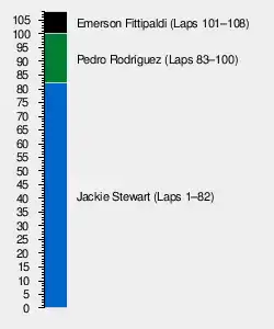 At the end of the 100th lap, Rodríguez coasted into the pit lane having run out of fuel. BRM refueled the car, but Rodríguez had lost 38 seconds to Fittipaldi, who took the lead. Rodríguez rejoined ahead of the second Lotus of Wisell.