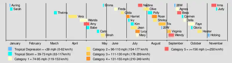 Hester (Goying)October 18 – 24Typhoon970 hPa (28.64 inHg)Philippines, North Vietnam, South Vietnam, Laos>$3.6 million119