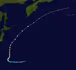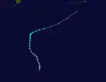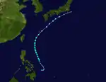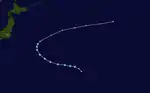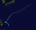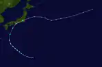 During January 8, the JMA started to monitor a tropical depression that had developed, about 500 km (310 mi) to the east of Ngerulmud, Palau.[3] Over the next day the system gradually developed further as it moved north-westwards, before it was classified as a tropical storm and named Sarah by the JTWC, after a US Navy plane had found an organised system.[3][4] The system subsequently recurved north-eastwards, before it was classified as a Severe Tropical Storm by the JMA during January 10.[5] During that day, the JTWC reported that the system had peaked, with 1-minute sustained wind-speeds of 95 km/h (60 mph).[4] Over the next day, the system quickly weakened and became an extratropical cyclone during January 11.[4] Sarah's extratropical remnants were subsequently tracked as they moved north-eastwards, until it made landfall on Canada and broke up over the mountains of British Columbia during January 17.[4]