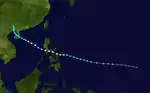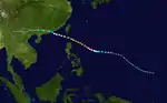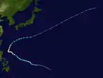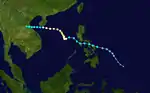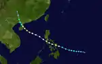 The strongest typhoon to strike the Philippines that year, this cyclone moved towards the region from the Marianas as a slow pace. Gusty southwest winds impacted western portions of Visayas and Luzon, including Manila, as the cyclone passed by on the 21st. The highest winds recorded were 190 kilometres per hour (100 kn) at Basco in Batanes. Heavy rains caused by the strong onshore flow led to heavy rains, which peaked at 379.5 millimetres (14.94 in) at Baguio City within 24 hours. The heavy rains led to severe flooding and landslides in north-central sections of the Philippines.[18]
