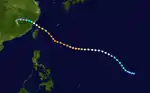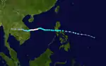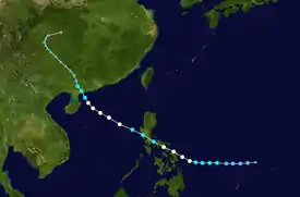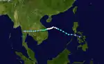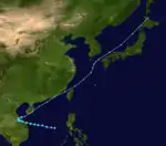 A disturbance in the ITCZ became a tropical depression on July 5. It headed northwest over the Philippines. It intensified into a tropical storm almost immediately after entering the South China Sea on July 8. It then turned north, and erratically drifted and looped for four days. On July 11, Susan became a typhoon. On July 14, Susan moved close to the Taiwan Strait. It made landfall on the coast of Fujian province, and dissipated inland on July 15.[8]