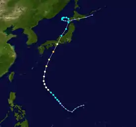 TessJuly 7–25Typhoon230 km/h (145 mph)940 hPa (27.76 inHg)Japan, Korean PeninsulaUnknown29