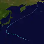 A tropical disturbance emerged from the ITCZ on July 29 and passed through the Marshalls. It became a tropical depression on July 30 and a tropical storm the next day. It and headed in the direction of Japan. Alice became a typhoon on August 2 and reached its maximum intensity on August 4 while southwest of Marcus. As Alice continued approaching Japan, it steadily weakened. It recurved, brushed Honshu, and went extratropical on August 8. It never made landfall.[10]