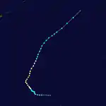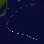 A tropical disturbance generated by an upper tropospheric low in the mid-Pacific trough moved westward through the Caroline Islands, slowly organizing into Tropical Depression 1W on January 5. The depression quickly strengthened, reaching tropical storm status later that day and becoming a typhoon on the 6th as it neared the Philippines. Kit rapidly intensified on the 6th and 7th to a 140 mph (230 km/h) typhoon, the strongest ever in January, but its inflow was cut off to the west, weakening the typhoon as it continued westward. Kit hit the eastern Philippines as a 100 mph (200 km/h) typhoon on January 7, and turned north through the archipelago in response to a break in the subtropical ridge. This brought Kit eastward then southward, where after completing its large loop it dissipated on January 15, just 170 nautical miles (310 km) from its starting location.[2]