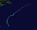 On August 11, a cold-core low was located south of Bermuda. Over the next week, the system warmed and moved toward the surface.[34] Around 12:00 UTC on August 18, the low developed into a tropical depression about 200 mi (320 km) west-southwest of the island,[2] after satellite imagery showed better organization and a ship reporting winds gusting to 46 mph (74 km/h).[34] Moving fairly quickly to the north-northeast, the depression intensified into Tropical Storm Candice about six hours later. Candice curved east-northeastward early on August 20 and weakened slightly, before re-strengthening later that day. By 06:00 UTC on August 20, the cyclone intensified into a hurricane.[2] Becoming a hurricane at 41.2°N, Candice was one of few Atlantic tropical storms to intensify into a hurricane while situated north of 40°N.[35] Around that time, Candice had decelerated and briefly turned to the southeast, before pivoting northeastward on August 21. Candice continued to intensify, peaking with sustained winds of 90 mph (150 km/h) and a minimum pressure of 964 mbar (28.5 inHg) later on the following day.[2] The hurricane then accelerated due to an approaching cold front, before merging with the front about 475 mi (765 km) east of Newfoundland at 12:00 UTC on August 24.[2][34]
