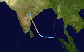 As the cyclone approached the Indian coast, it accelerated to 17 km/h (10 mph) while slightly weakening from its peak intensity. The storm made landfall near Chirala, in the Prakasam district of central Andhra Pradesh, around 11:00 UTC on 19 November with one-minute sustained winds of 195 km/h (120 mph). Moving northwards over flat agricultural lands, the storm weakened, with the JTWC issuing its final warning at 20:00 UTC that evening.[2] The IMD continued tracking the system, reporting that it weakened into an area of low pressure on the evening of 20 November before dissipating over southeastern Madhya Pradesh and Odisha the next evening.[6]