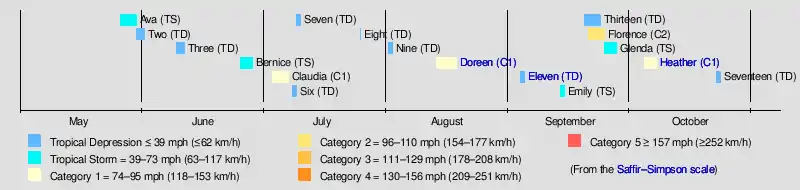 Despite the season featuring the lowest number of tropical storms on record at the time, there were numerous tropical depressions that failed to intensify into named storms. The first two tropical depressions existed from May 25–30 and from May 30–June 1, both west of the Honduras–Nicaragua border. Tropical depressions Six and Seven occurred in quick succession from July 8–9 and July 9–10, respectively. Tropical Depression Eight occurred solely on July 25, while Tropical Depression Nine existed from August 1–2. Yet another cyclone existed from September 3–4, while the seventeenth and final unnamed system formed on October 22 and dissipated on the next day.[5]