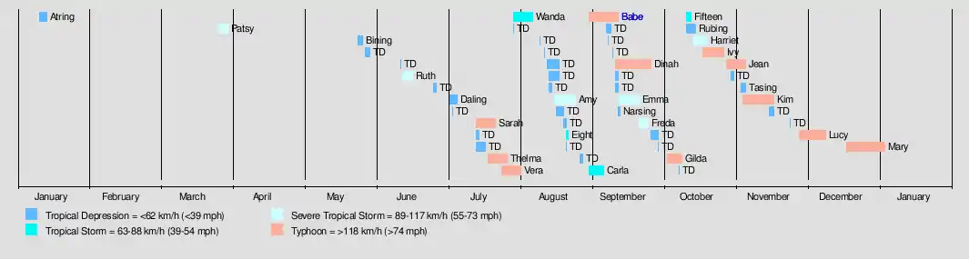 | Babe (Miling) | August 31 – September 12 | Typhoon | 205 km/h (125 mph) | 905 hPa (26.72 inHg) | Caroline Islands, Ryukyu Islands, East China | $23 million | 23 | |