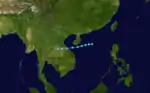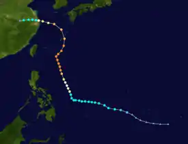 Developing as a tropical depression on September 2, Babe initially tracked west-northwestward as it intensified. On September 5, an abrupt shift in steering currents caused the system to turn north-northwestward. Over the following two days, Babe quickly intensified, ultimately attaining its peak intensity early on September 8 with winds of 240 km/h (150 mph) and a barometric pressure of 905 mbar (hPa; 26.72 inHg). Not long after reaching this strength, another shift in the steering patterns caused the typhoon to execute a prolonged counter-clockwise arc, causing it to track through the Ryukyu Islands, as it interacted with a low pressure originating from the Korean Peninsula. During this time, the system gradually weakened and eventually it made landfall near Shanghai, China on September 11 as a minimal typhoon before dissipating inland the following day.[2][3]
