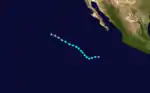 The season's second tropical cyclone began as a disturbance spawned by an African tropical wave southwest of the Mexico coastline on June 15.[4] It moved generally westward over very warm waters, and observations from satellite imagery and ships outlined the formation of a tropical depression by 00:00 UTC on June 17.[5] Six hours later, the depression intensified into Tropical Storm Bud.[6] Continued ship observations relayed Bud's intensification to a 60 mph (95 km/h) cyclone on June 18, but the storm weakened thereafter as it moved west-northwest,[5] and it ultimately dissipated within the ITCZ after 06:00 UTC on June 20 while located over the open East Pacific.[6][7]