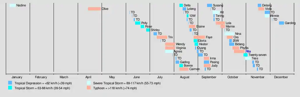 Rita (Kading)October 17 – 30Typhoon220 km/h (140 mph)880 hPa (25.98 inHg)Caroline Islands, Mariana Islands, Philippines$100 million>300