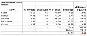 In the election, Labor finished only 0.8 percent behind the Coalition on the two-party vote—a four-percent swing from 1977. However, due to the uneven nature of the swing, Labor came up 12 seats short of a majority, giving the Coalition a third term in government. Hayden, however, did manage to regain much of what Labor had lost in the previous two elections. Notably, he managed to more than halve Fraser's majority, from 48 seats at dissolution to 23.