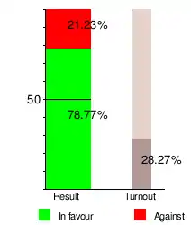 The referendum resulted in 78.8% of valid votes in support of the bill on a turnout of just 28.3%.[2][3][4] Once approved, the bill was submitted to the consideration of the Cortes Generales, which accepted it on 17 February 1981 (in the Congress of Deputies) and 17 March (in the Spanish Senate), receiving royal assent on 6 April and published in the Official State Gazette on 28 April 1981.[5][6]