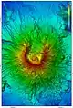 A film crew was dropped by helicopter on Mount St. Helens on May 23 to document the destruction, but their compasses spun in circles and they quickly became lost.[45] A second eruption occurred the next day (see below), but the crew survived and was rescued two days after that. The eruption ejected more than 1 cu mi (4.2 km3) of material.[46] A quarter of that volume was fresh lava in the form of ash, pumice, and volcanic bombs, while the rest was fragmented, older rock.[46] The removal of the north side of the mountain (13% of the cone's volume) reduced Mount St. Helens' height by about 1,300 ft (400 m) and left a crater 1 to 2 mi (1.6 to 3.2 km) wide and 2,100 ft (640 m) deep with its north end open in a huge breach.[46]