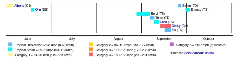Tropical Storm Beryl formed on August 28, after a quiet July in the open Atlantic Ocean. Beryl grazed Cape Verde, killing 3 people. Tropical Depression Three formed just behind Beryl, tracking east and north of the Caribbean sea in early September. Soon after the dissipation of Beryl, Tropical Storm Chris formed in the Gulf of Mexico on September 9. Chris stayed a weak storm, making landfall near Sabine Pass, Texas, and dissipating over land on September 13. Hurricane Debby was the next storm and the strongest of the season. The formative stage of Debby produced rainfall in Puerto Rico and soon strengthened into a Category 4 Major Hurricane. Debby passed by Newfoundland on September 18 and merged with a non-tropical low on September 20. In mid-September, Tropical Depression Six formed west of Africa, and tracked west-northwest, dissipating before reaching the Leeward Islands on September 20. Its remnant thunderstorm activity continued moving west-northwest, forming Tropical Depression Seven which moved near Bermuda on September 25 before dissipating offshore Nova Scotia. The final storm of the season, Tropical Storm Ernesto, was the shortest-lasting system and stayed out to sea, dissipating on October 2.
