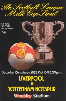 The 1982 Football League Cup Final was a football match between Liverpool and Tottenham Hotspur on 13 March 1982 at Wembley Stadium. It was the final match of the 1981–82 Football League Cup, the 22nd staging of the Football League Cup, a football competition for the 92 teams in The Football League. Liverpool were the reigning champions and appearing in their third final. This was Tottenham's third final, having won their previous two appearances in 1971 and 1973.