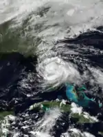 The origins of Tropical Storm Edouard are unclear, but an area of persistent organized storms formed in the Bay of Campeche, which strengthened into a tropical storm on September 14. Edouard rapidly intensified, with wind speeds reaching 65 miles per hour (105 km/h) in 18 hours as a faint eye feature became visible. Following its strengthening, Edouard dissipated even more quickly, degenerating into an area of thunderstorms the next day.[31] The remnants of Edouard moved over land near the port of Veracruz.[32]