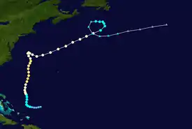 Hurricane Lili was one of only four Atlantic tropical cyclones on record to reach hurricane status in the month of December.[4][42] Lili developed as a subtropical cyclone which originated from a frontal trough to the south of Bermuda on December 12. It tracked southeastward,[43] then northward, slowly attaining tropical characteristics and becoming a hurricane on December 20. Lili turned to the south and southwest, briefly threatening the northern Caribbean islands before weakening and dissipating near the coast of the Dominican Republic. Lili was the longest lasting tropical cyclone outside of the Atlantic hurricane season, as well as the strongest hurricane to form during the month of December. It briefly threatened to pass through the Leeward Islands as a minimal hurricane, though upon passing through the area as a dissipating tropical depression Lili produced light rainfall and no reported damage.[44]