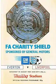 The 1984 FA Charity Shield (also known as the FA Charity Shield sponsored by General Motors for sponsorship reasons) was the 62nd Charity Shield, a football match contested by the holders of the Football League First Division and FA Cup. This edition featured a Merseyside derby between Liverpool and Everton at Wembley Stadium. Liverpool won the League and Everton won the FA Cup. The match was held on 18 August 1984 and was won 1–0 by Everton after an own goal from Bruce Grobbelaar. Graeme Sharp was straight in on goal and tried to round Grobbelaar, but the ball was blocked on the line by Alan Hansen and ricocheted straight at the shins of Grobbelaar and back into the net.[1]