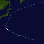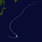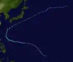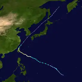 An upper-level low retrograded westward across the tropical Pacific Ocean beginning on July 4. On July 8, a tropical disturbance formed southeast of the upper low southwest of Enewetak Atoll. The system moved westward, slowly organizing. Becoming a tropical depression on July 13, the small system turned northwest, recurving gradually around a subtropical ridge to its east and northeast. The system strengthened into a tropical storm later on July 13, and a typhoon on July 14 to the south of Japan. After turning to the northeast, the system began to experience northeasterly vertical wind shear and began to weaken. After passing east of Okinawa, the system began to transition into an extratropical cyclone, a process which completed on July 17 near the southern coast of Japan.[2]