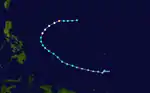 Wayne turned southward, becoming a typhoon again on August 30. Wayne passed close to northern Luzon on September 2 before turning back to the west. Two days later while moving quickly westward through the South China Sea, Wayne reached a peak of 85 knots (157 km/h) winds. During its various passages of Hong Kong, a total of 295 millimetres (11.6 in) of rainfall accumulated at Sai Kung.[1] The cyclone hit northern Hainan on September 5, entered the Gulf of Tonkin, and made its final landfall on northern Vietnam later that day as a 60 knots (110 km/h) tropical storm. The next day, Wayne dissipated over Vietnam, after 85 advisories and being the longest lasting Western Pacific system in history.[2] Wayne brought torrential rains through its path to the Philippines, Taiwan, southeastern China, Hainan Island, and Vietnam. Because of this, 490 fatalities (most in Vietnam), tens of thousands left homeless,[2] and US$399 million (1986 dollars) in damage can be attributed to Typhoon Wayne.