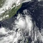 Developing in the Philippine Sea on July 30, the system developed as it moved westward, becoming a tropical storm on July 31. On August 1, its mid-level circulation center crossed into the South China Sea while its surface circulation was left behind east of the Philippines. Sarah's broad circulation center was difficult to locate until it began moving northeast east of Luzon on August 2, when it intensified to its peak intensity. As Sarah moved east of Honshu, it evolved into an extratropical cyclone.[2] Fourteen died in Japan due to Sarah.[1]