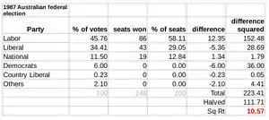 The 1987 federal election was called 6 months early by Prime Minister Hawke to capitalise on the aforementioned disunity in the opposition. The nominal trigger for the double dissolution was the rejection of legislation for the Australia Card by the Senate, but it did not figure prominently in the campaign, and Labor Senate Leader John Button even burst into laughter when referring to it in his speech announcing the election. Caught off guard by the early election, the opposition quickly ran into difficulties when the funding for its flagship tax cut proposals was revealed to have been miscalculated by some $540 million (at the time), a mistake brought up by the Labor party and conceded by Howard.[7] Furthermore, although the Joh for Canberra push had been abandoned, the resulting schism between the Nationals and Liberals led to several three-cornered contests and the National Party ran independent Senate tickets in every state except New South Wales.[8] Labor therefore chose to campaign strongly on the disunity amongst the opposition parties, contrasting it with the relative unity of purpose of the Labor Government. However, aside from these issues, the 1987 campaign failed to generate great excitement on the part of the electorate, and the opposition was viewed as unlikely (particularly in view of the infighting that had recently taken place on the conservative side of politics) to be able to remove the Labor party from power. This was a view strengthened by much of the polling during the campaign, which generally showed Labor with a commanding lead.[9] This election was the last time the Liberals and Nationals competed directly against each other in a federal election.