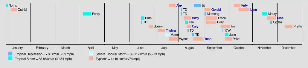 | Nina (Sisang) | November 19–30 | Typhoon | 165 km/h (105 mph) | 930 hPa (27.46 inHg) | Caroline Islands, Philippines, South China | $84.5 million | 912 | |