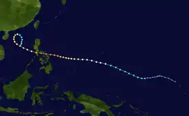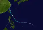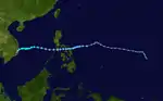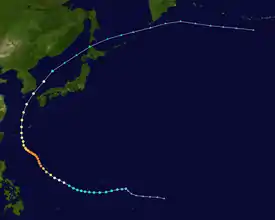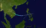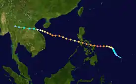 Typhoon Betty formed from the monsoon trough that, according to the JMA, spawned a tropical depression on August 8 while around positioned well to the east of the Philippines.[4][5] It drifted northwestward,[4] becoming a tropical storm on August 9 and a typhoon on August 10.[5] Betty turned westward, where it rapidly intensified, becoming the second super typhoon of the season, before attaining peak intensity on August 11. The next day, Typhoon Betty made landfall in the central Philippines. Betty weakened rapidly over the country, but restrengthened somewhat over the South China Sea. Land interaction weakened Betty slightly before it hit central Vietnam on August 16. The next day, Betty dissipated.[4]