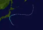 Typhoon Freda developed from an active monsoon trough; the precursor disturbance to Freda was first noted on September 1. A low-level center first began evident two days later,[4] and on September 4, the JMA classified the disturbance as a tropical depression,[5] with the JTWC following suit at 18:00 UTc that day. After passing Guam, Freda began to intensify at a faster clip;[4] both the JTWC and JMA upgraded the depression into Tropical Storm Freda on the morning of September 5.[4][5] Quasi-stationary, Freda steadily intensified, and following the appearance of a small eye on satellite imagery,[4] Freda was upgraded into a typhoon by both the JTWC and JMA.[4][5] After executing a small counterclockwise loop, Freda turned northeast.[4] On September 10, the JTWC and JMA, based on Dvorak analysis, estimated that Freda reached its peak wind spreed, with winds of 235 km/h (145 mph) and 195 km/h (120 mph) respectively.[4][5] Typhoon Freda began to round the western periphery of a ridge, which caused the system to accelerate towards the north. The JTWC estimated that Freda weakened to a tropical storm during the evening hours of September 13;[4] however, the JMA maintained the storm at typhoon intensity for several additional days.[5] By September 16, Freda began to interact with a mid-level trough to the north, which resulted in a turn to the northeast. After bypassing Honshu, wind shear began to take toll on the system and Freda began to turn extratropical.[4] On September 17, the JTWC declared Freda extratropical,[4] with the JMA doing the same the following day. It was lasted noted on September 20.[5]