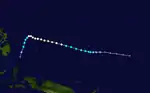 The initial disturbance that would become Typhoon Wynne formed east of the International Date Line on July 20. Embedded in an environment of moderate wind shear, the disturbance slowly became more organized while tracking west.[4] On July 21, the JMA classified the system as a tropical depression.[5] Both the JTWC and JMA upgraded the depression into Tropical Storm Wynne at 06:00 UTC on July 22.[4][5] After Wynne developed a central dense overcast, a large mass of deep convection,[4] the JMA upgraded Wynne to a severe tropical storm midday on July 23.[5] Later that day, the JTWC upgraded Wynne into a typhoon while the typhoon passed over the northern Marianas island of Alamagan. On the next day, after the storm developed an eye,[4] the JMA followed suit and classified Wynne as a typhoon.[5] A smaller than average typhoon, Wynne turned west-northwest. By July 26, Wynne reached its maximum intensity,[4] with the JTWC reporting winds of 230 km/h (145 mph) and the JMA reporting winds of 185 km/h (115 mph).[4][5] of 145 mph (230 km/h). As it rounded the western periphery of the subtropical ridge, the cyclone became sheared from the north, which caused the storm to weaken and its center to become exposed from the deep convection. Even so, it maintained typhoon intensity until July 30,[4] according to both agencies.[4][5] Recurving east of Honshū, Wynne continued to weaken.[4] Both the JTWC and JMA determined that Wynne transitioned into an extratropical cyclone by the afternoon of July 31,[4][5] although the JMA continued to track Wynne for five additional days.[5]