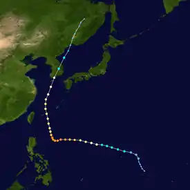 Thelma was first designated by the JMA as a tropical depression on July 7.[5] After moving north, Thelma turned west, while remaining poorly organized.[4] It finally attained typhoon status on July 9,[5] soon after developing an eye, and began to intensify at a brisker clip, and on July 10, the JTWC upgraded Thelma into the first super typhoon of the season.[4] During the evening of July 10, Thelma attained maximum intensity[5] while well to the east of the Philippines. It also turned sharply northward in response to a trough while also slowly weakening. On July 15, Typhoon Thelma, now greatly reduced in intensity, struck the south coast of South Korea. The next day, Thelma rapidly dissipated, shortly after emerging into the Sea of Japan.[4]