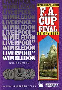 The 1988 FA Cup Final was the 107th final of the FA Cup. It took place on Saturday, 14 May 1988 at Wembley Stadium and was contested between Wimbledon and Liverpool, the dominant English club side of the 1980s and newly crowned league champions.[1][2]