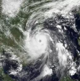 On July 6 a tropical depression formed west of Luzon. Tracking generally westward, the system soon strengthened into Tropical Storm Faye. On July 8, the storm struck the Philippines as a severe tropical storm before moving into the South China Sea. Struggling to regain strength, the system subsequently made landfall in northern Hainan Island. After briefly emerging into the Gulf of Tonkin, Faye made its third and final landfall near Hai Phong, Vietnam on July 11. Once onshore, Faye rapidly dissipated.[24]