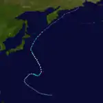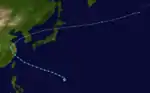 Developing as a disturbance in the Philippine Sea on June 18, the system moved westward initially and became a tropical depression late on June 20 and weakened on June 21. Early on June 23, the large system with gales well removed from its center became a tropical depression once more. A trough to its northwest had deepened, which was accelerating the cyclone northward. It became a minimal tropical storm during this acceleration. Late that day, it became a frontal wave before moving through Japan into the Sea of Japan.[22]