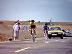 ![]() Santos Hernandez (ONCE) and Pedro Delgado (Reynolds), during the race | |||||||||||||||||||||||||||||||||||||||||