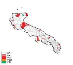 Christian Democracy was by far the largest party, largely ahead of its major competitors, the Italian Communist Party, which had its worst result ever in a regional election, and the Italian Socialist Party, that gained its best result ever and even surpassed the Communists.