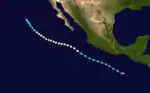 A tropical wave that moved off the northwest coast of Africa on July 4 passed through the Atlantic Ocean and Caribbean Sea without significant development.[34] The wave moved across Central America into the northeastern Pacific Ocean on July 15. Thunderstorm activity increased in the system between July 16 and 18 before rainbands became present within the tropical disturbance on July 19. Tropical Depression Nine-E formed later that day while 565 mi (910 km) southwest of Acapulco, Mexico.[5]