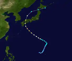 | Winona | August 4 – 11 | Severe tropical storm | 110 km/h (70 mph) | 975 hPa (28.79 inHg) | Japan | None | Unknown | |