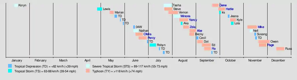 | Russ | December 13 – 23 | Typhoon | 185 km/h (115 mph) | 915 hPa (27.02 inHg) | Marshall Islands, Mariana Islands, Caroline Islands | $120 million | None | |